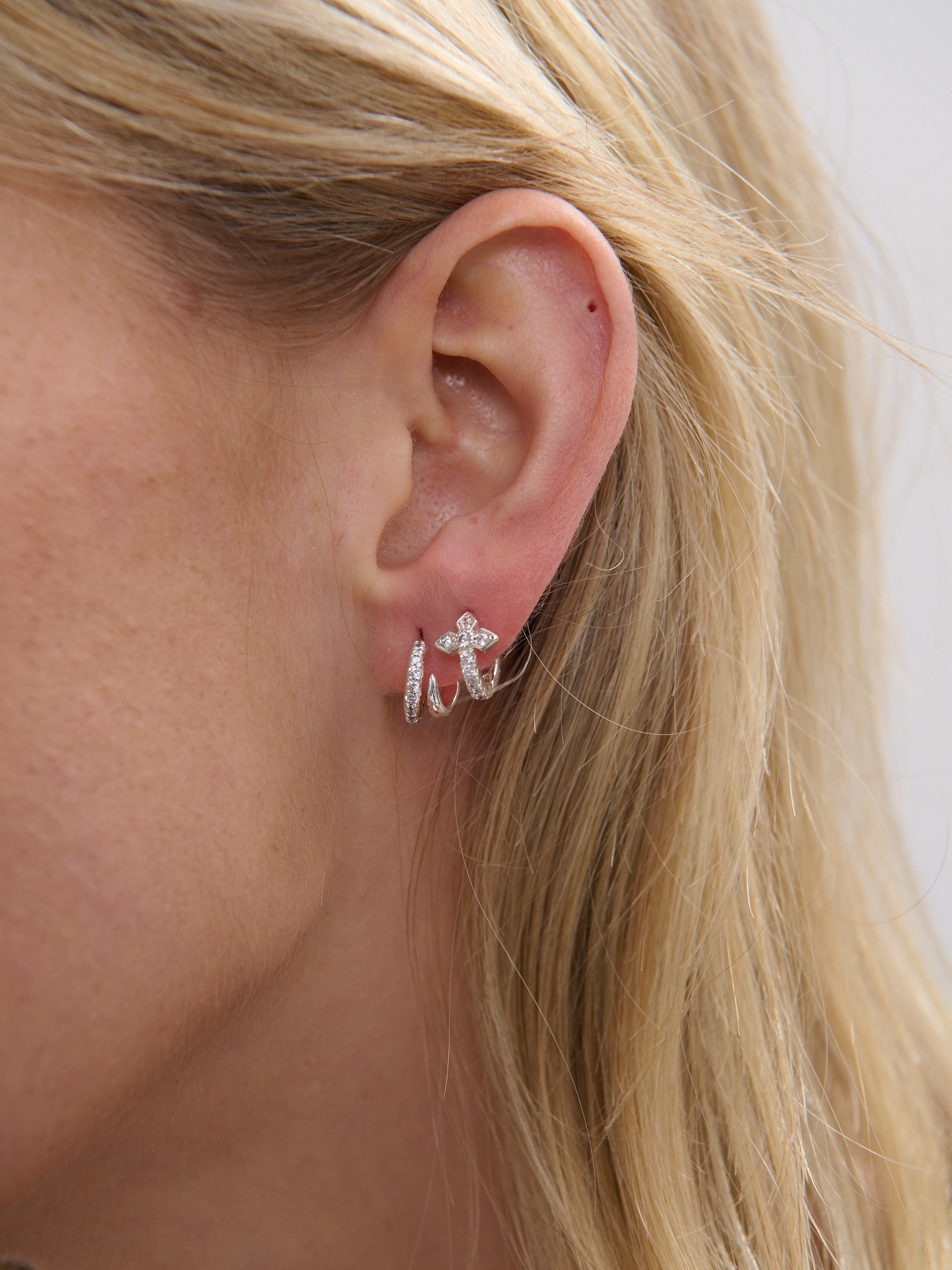 A minimalist huggie accented with a delicate cross motif, traced in fine diamantés.