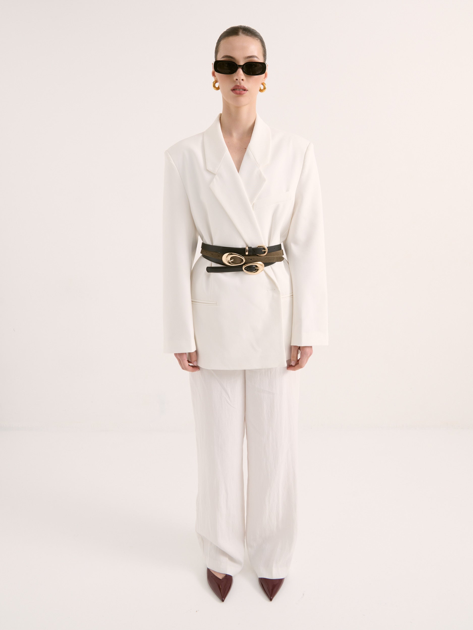 The Celina Organic Buckle Belt features a black leather strap paired with a gold-toned buckle in soft, organic curves. Timeless and refined, it adds a subtle statement to minimalist outfits.